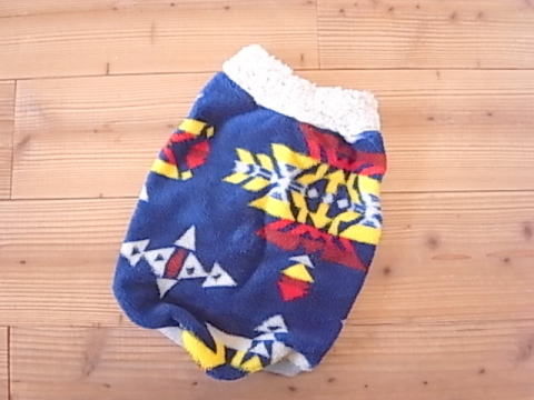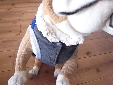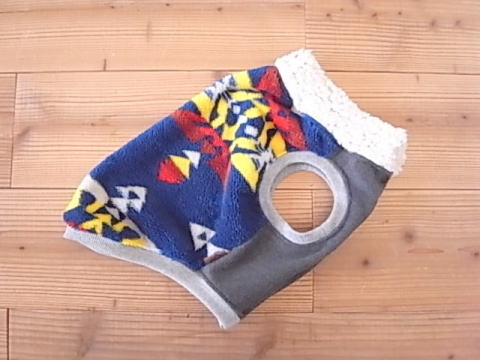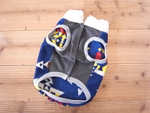 肉厚なボアを背中側に使用し、前開きのベストタイプに仕上げました。おなかは柔らかなフリースです。